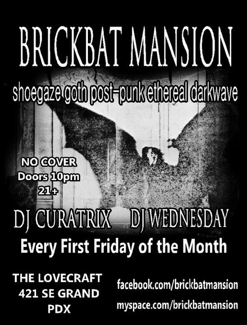 1st Friday - Brickbat Mansion w/ DJs Curatrix and Wednesday. Goth, shoegaze, post-punk, ethereal, darkwave.